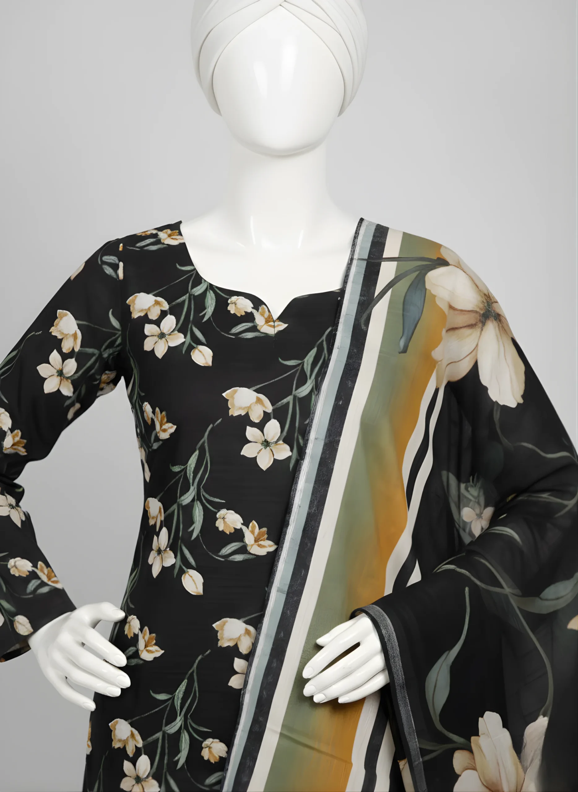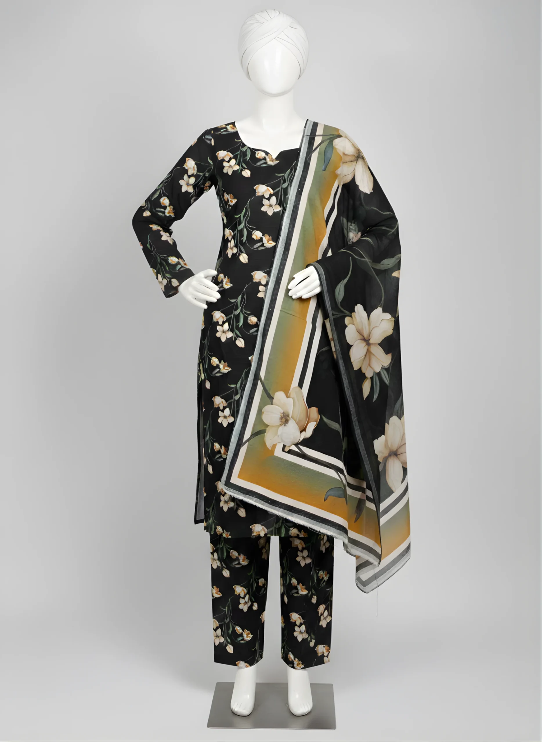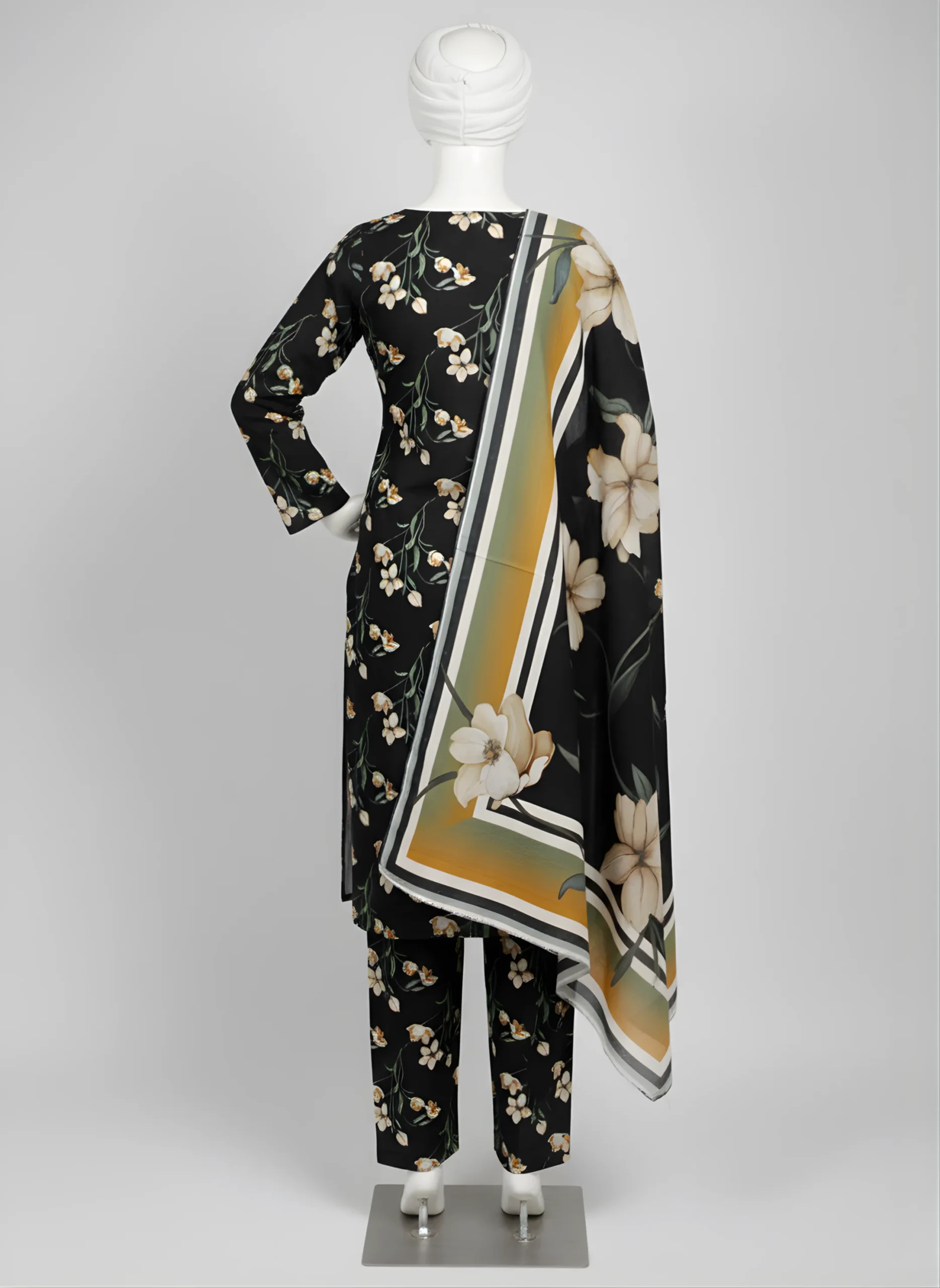 Our three-piece black Bana Dora suit includes a printed shirt and matching printed trouser. It is paired with a printed Bana Dora dupatta for a graceful, coordinated look.