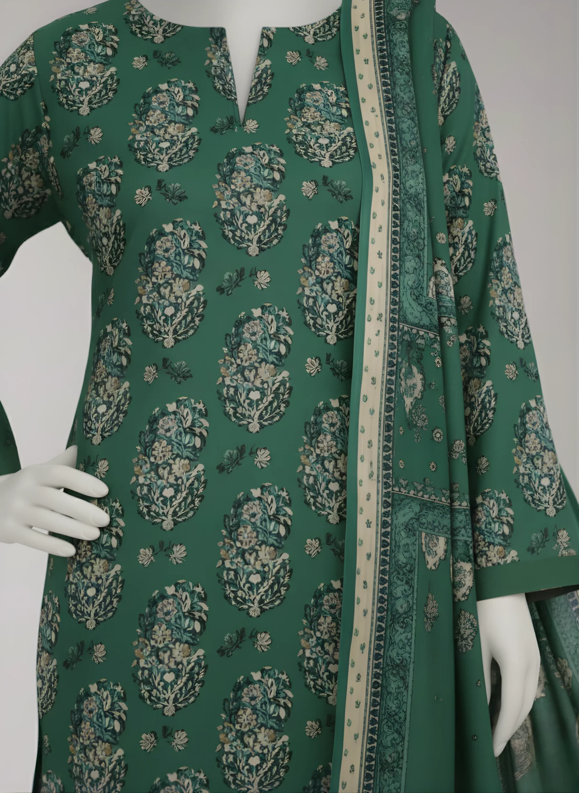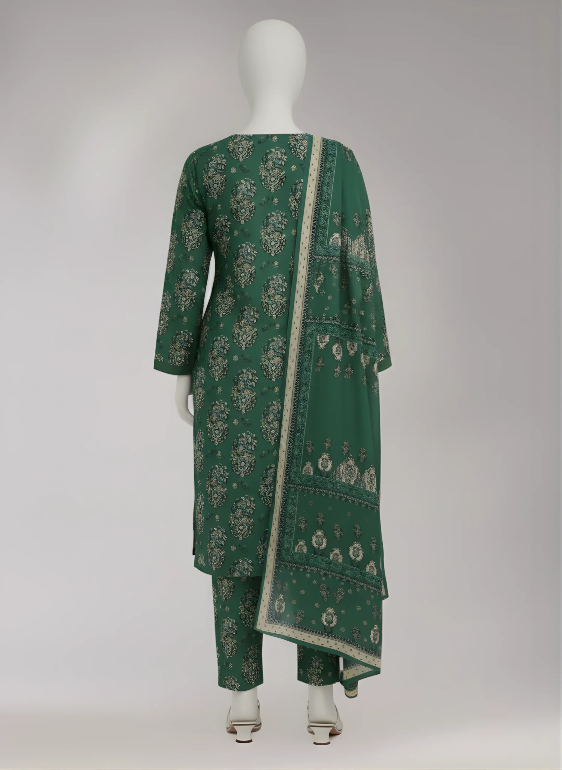 Our three-piece bottle green Bana Dora suit includes a printed shirt and matching printed trouser. It is paired with a printed Bana Dora dupatta for a graceful, coordinated look.