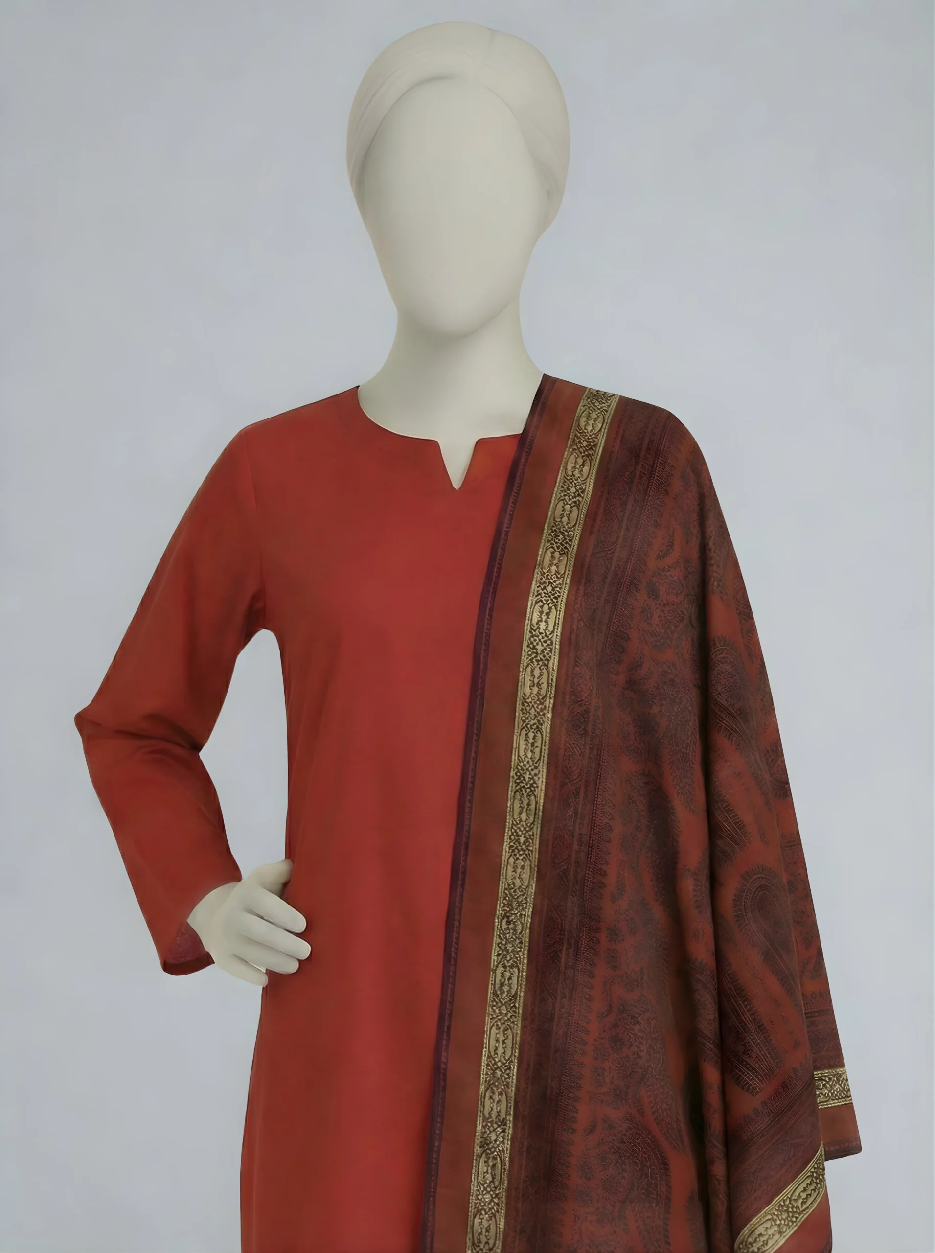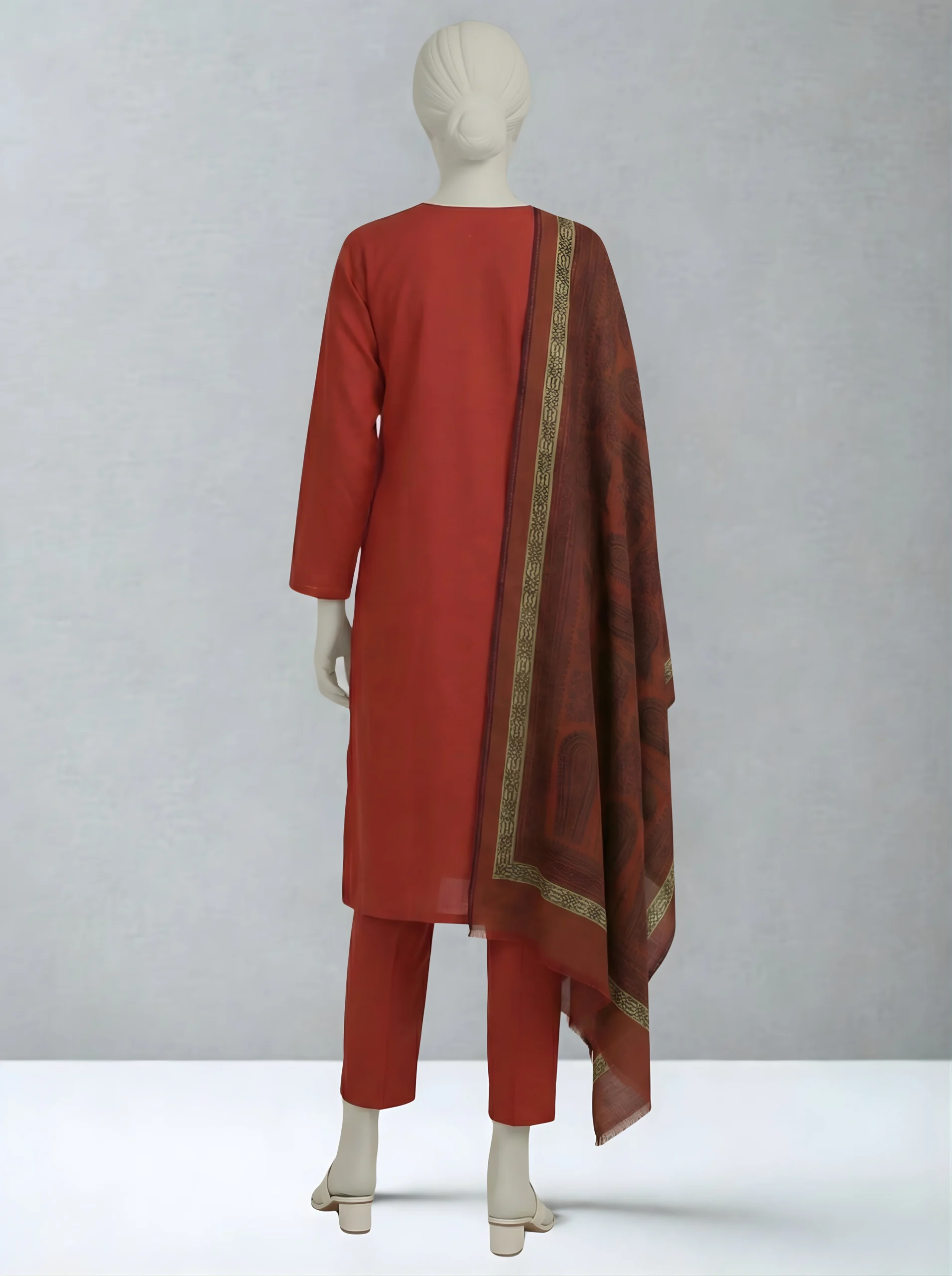 Introducing our three-piece brick red Dhanak suit, featuring a shutter-less dyed Dhanak shirt and trouser. It comes with a ready-to-wear Jacquard shawl for a refined and elegant finish.