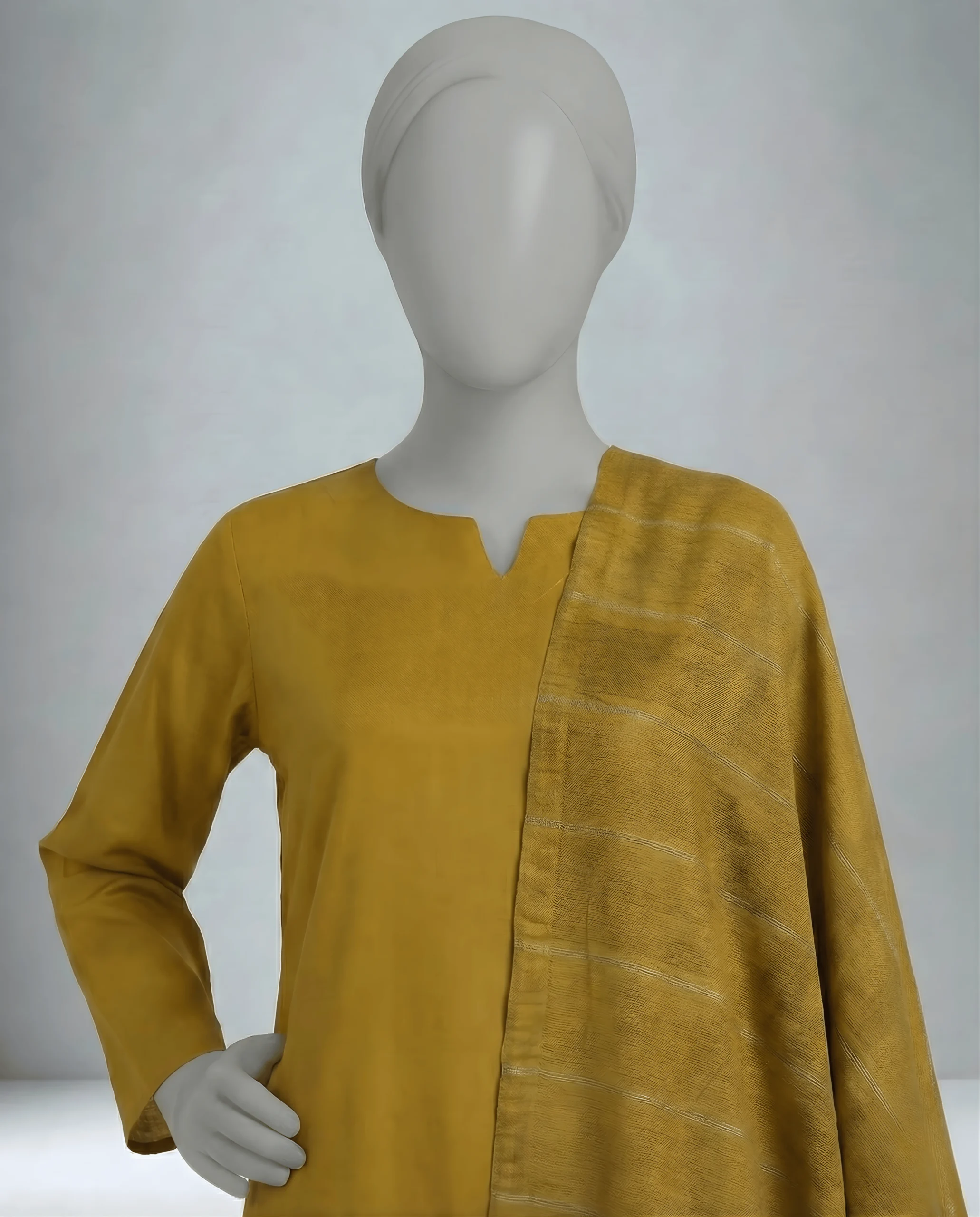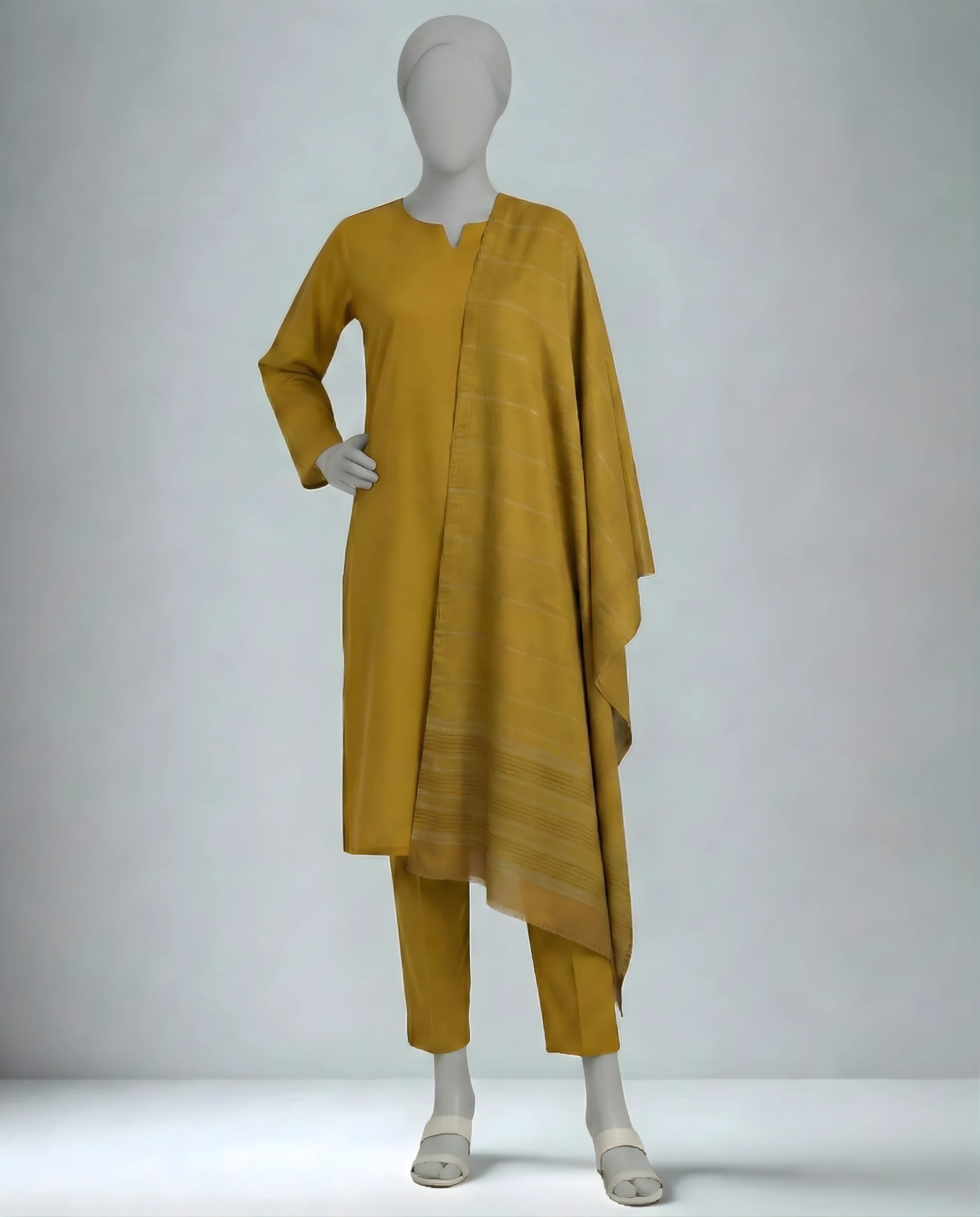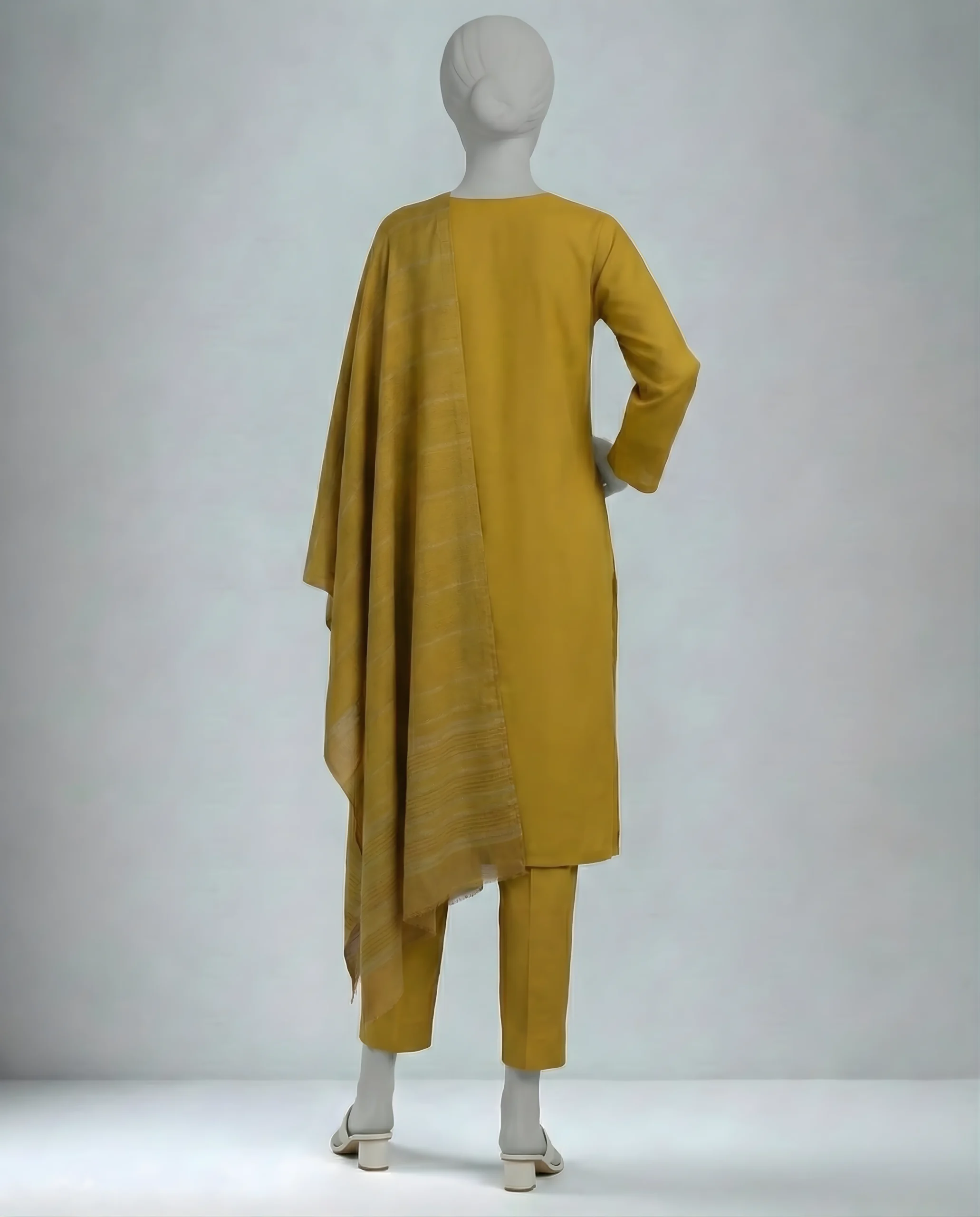 Introducing our three-piece mustard yellow Dhanak suit, featuring a shutter-less dyed