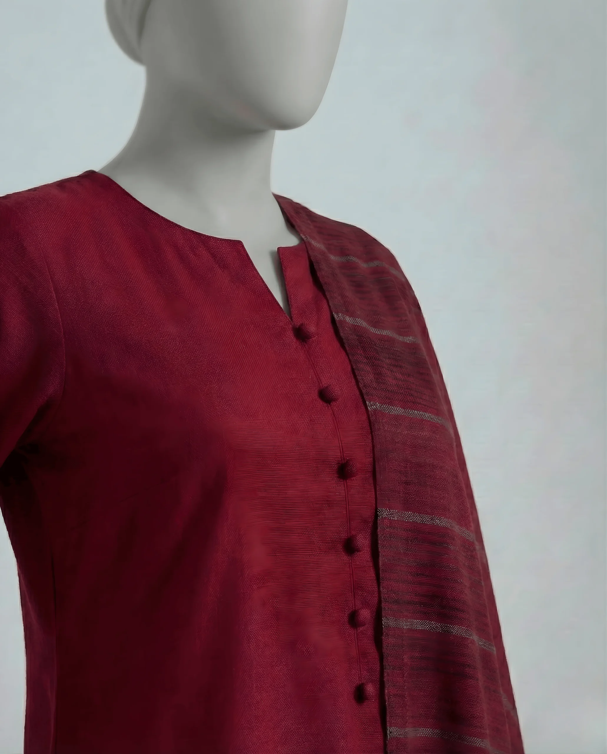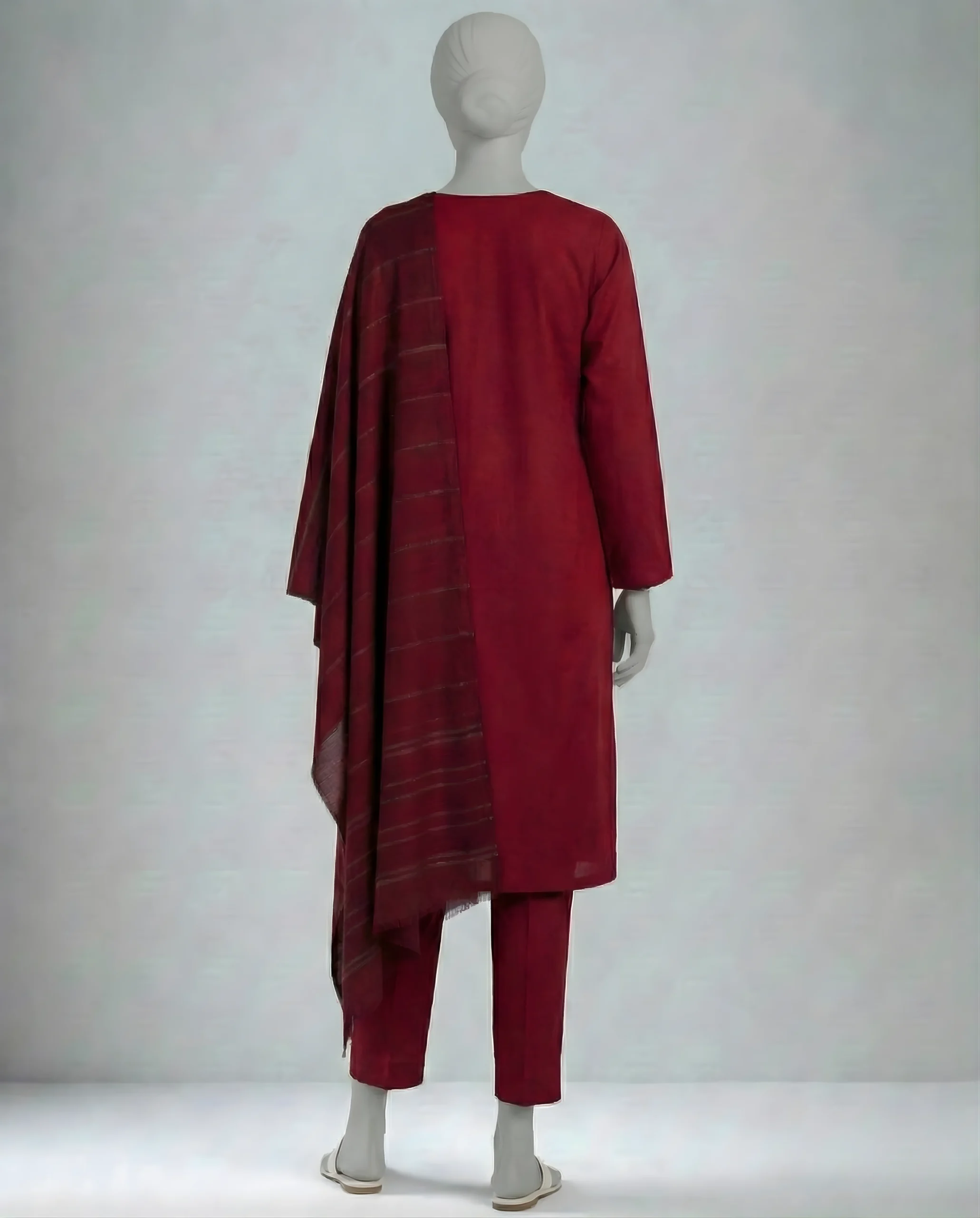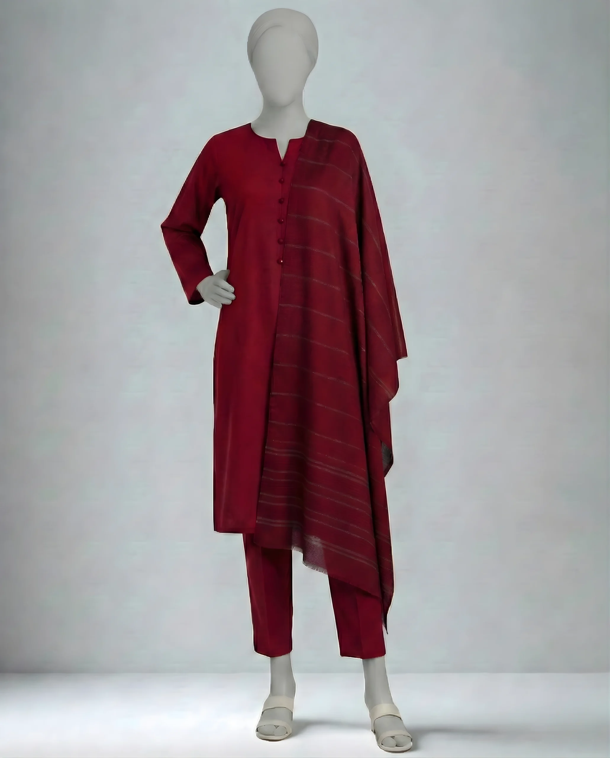 Introducing our three-piece brick red Dhanak suit, featuring a shutter-less dyed Dhanak shirt