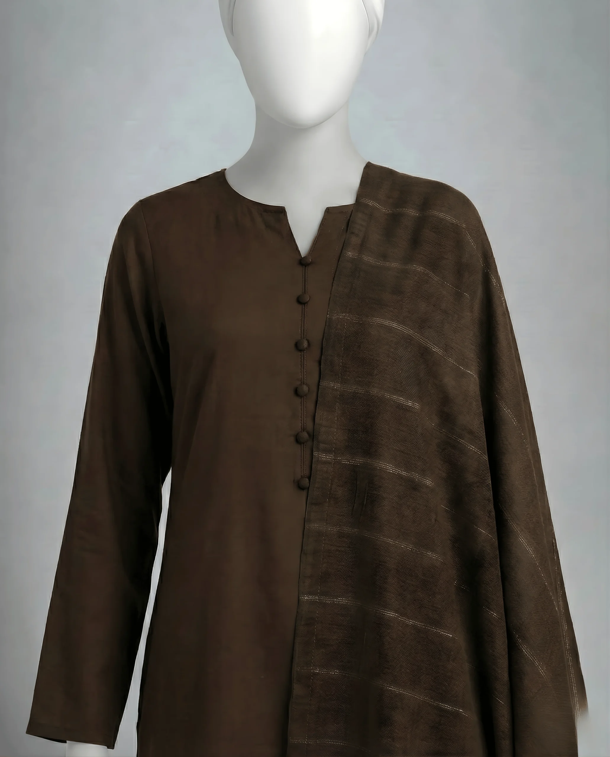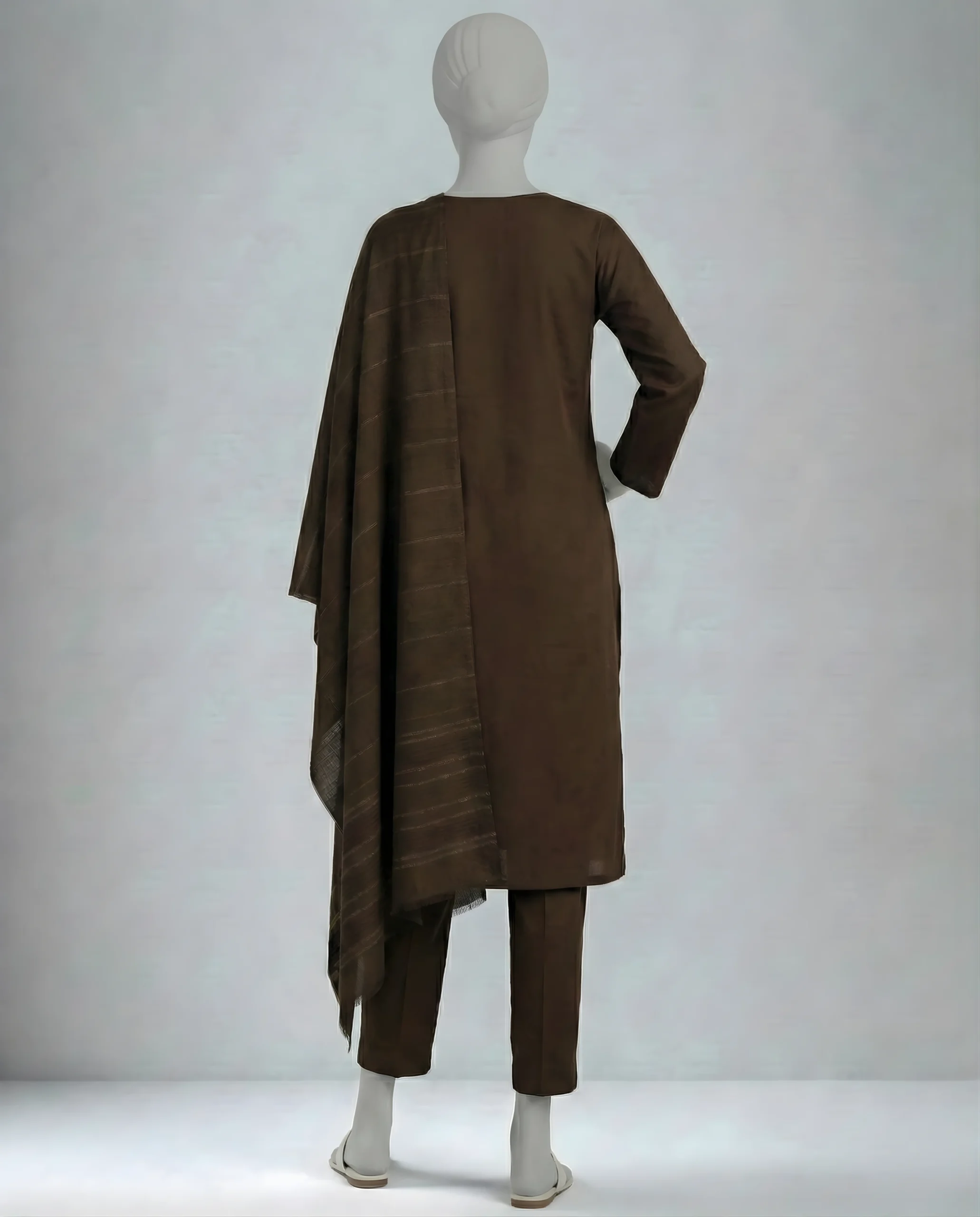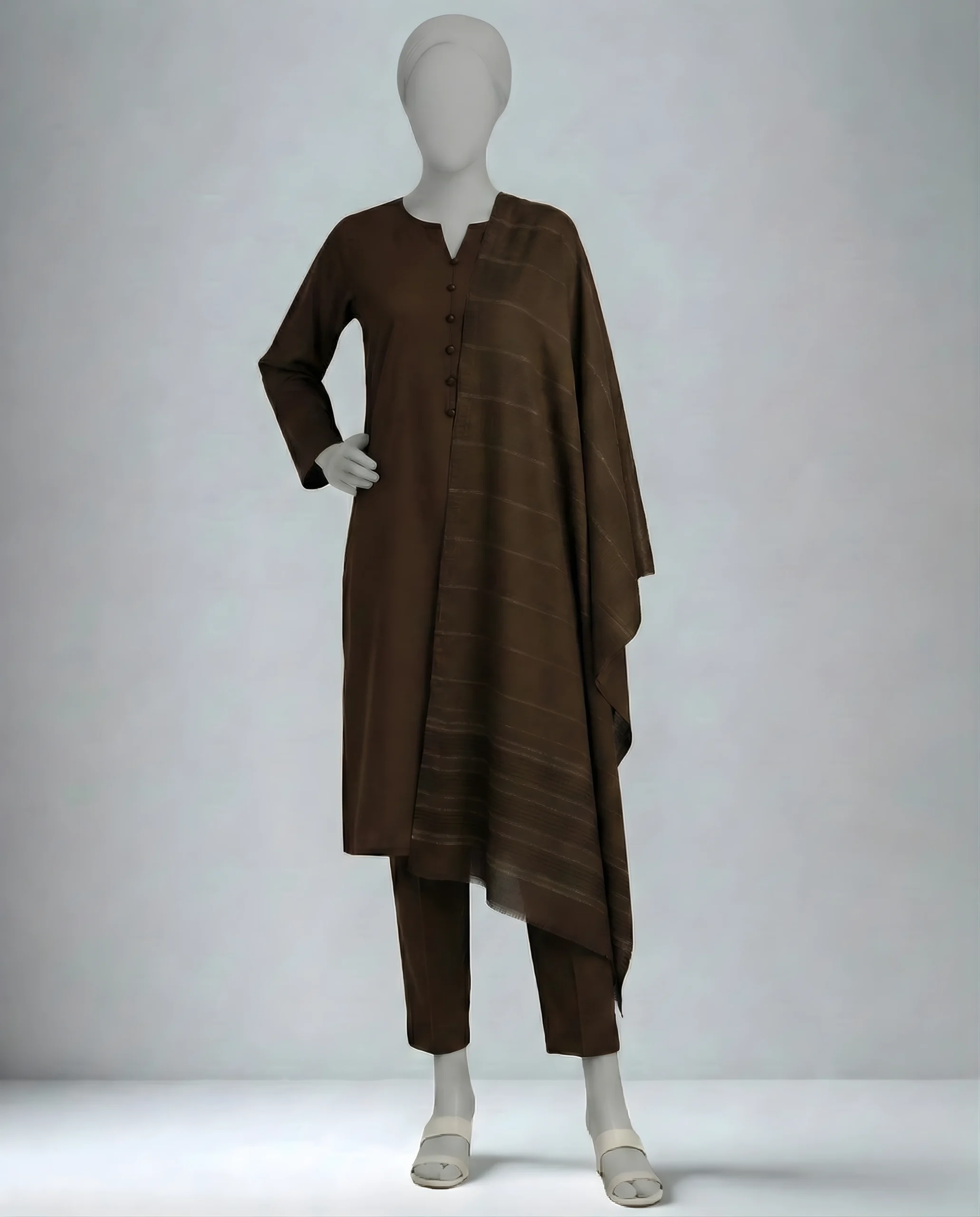 Introducing our three-piece deep brown Dhanak suit, featuring a shutter-less dyed Dhanak
