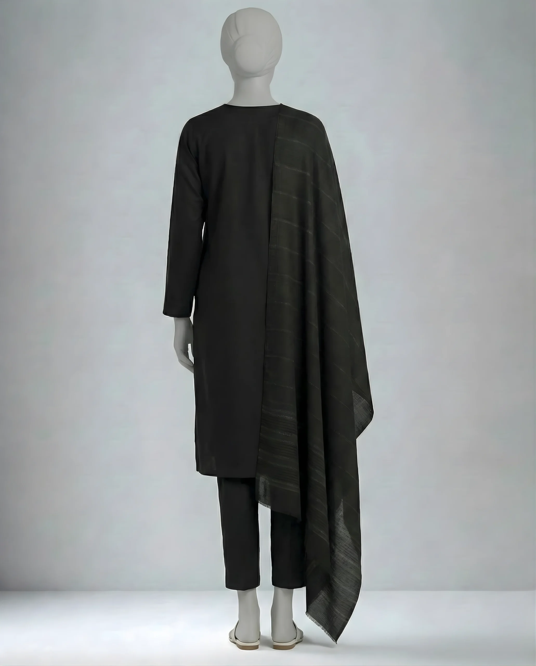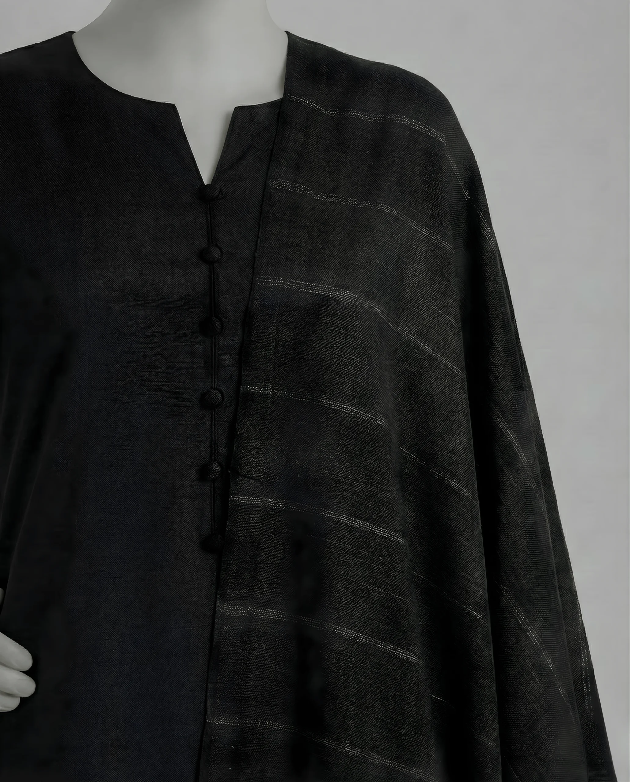 Introducing our three-piece jet black Dhanak suit, featuring a shutter-less dyed Dhanak shirt