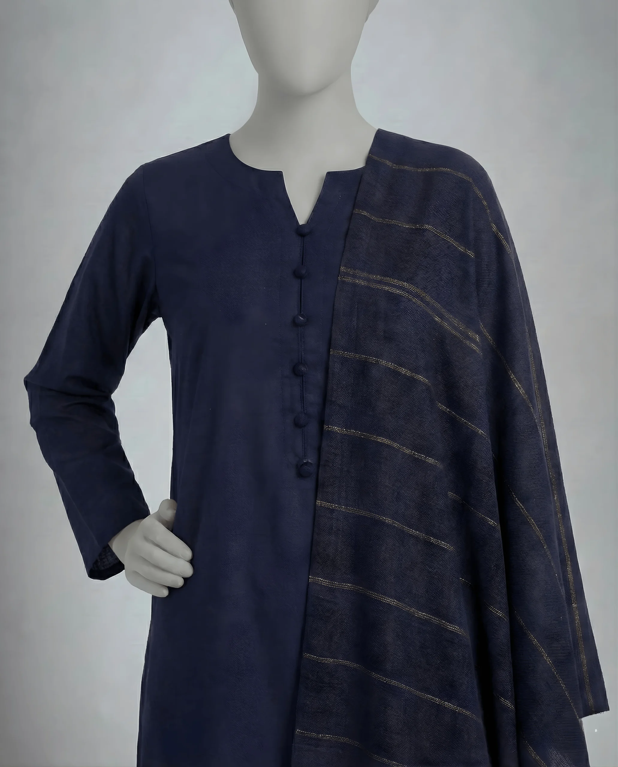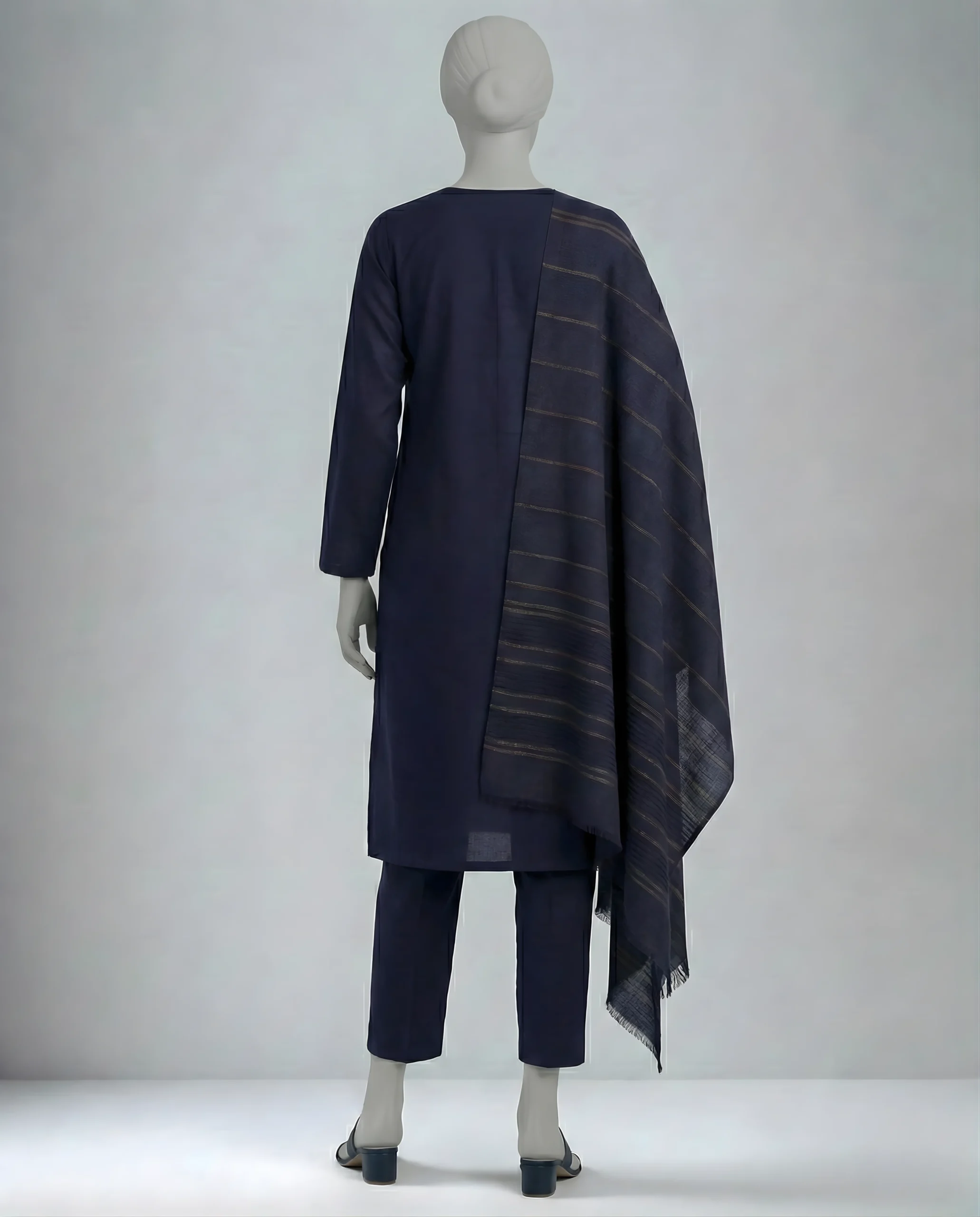 Introducing our three-piece navy blue Dhanak suit, featuring a shutter-less dyed Dhanak