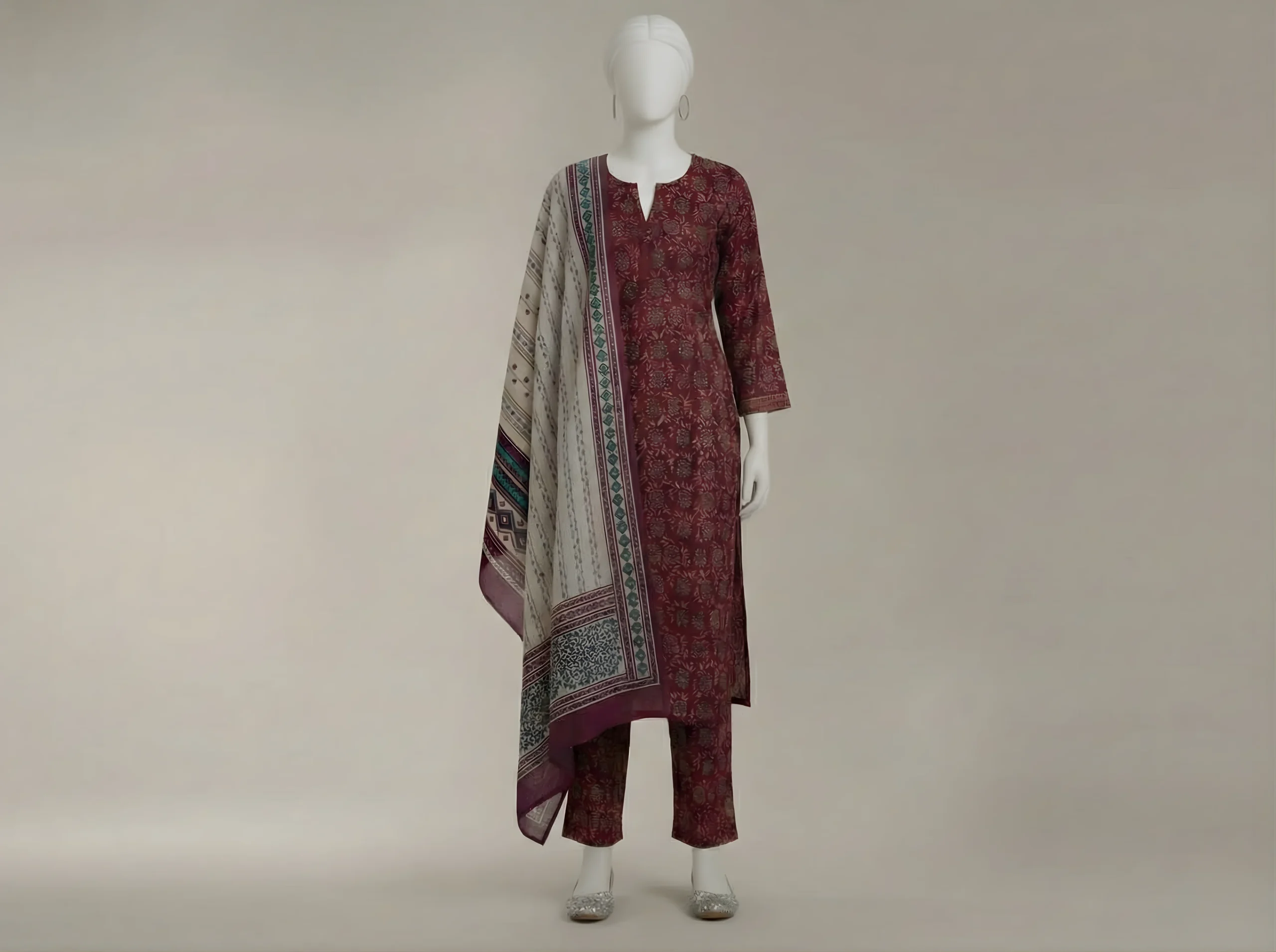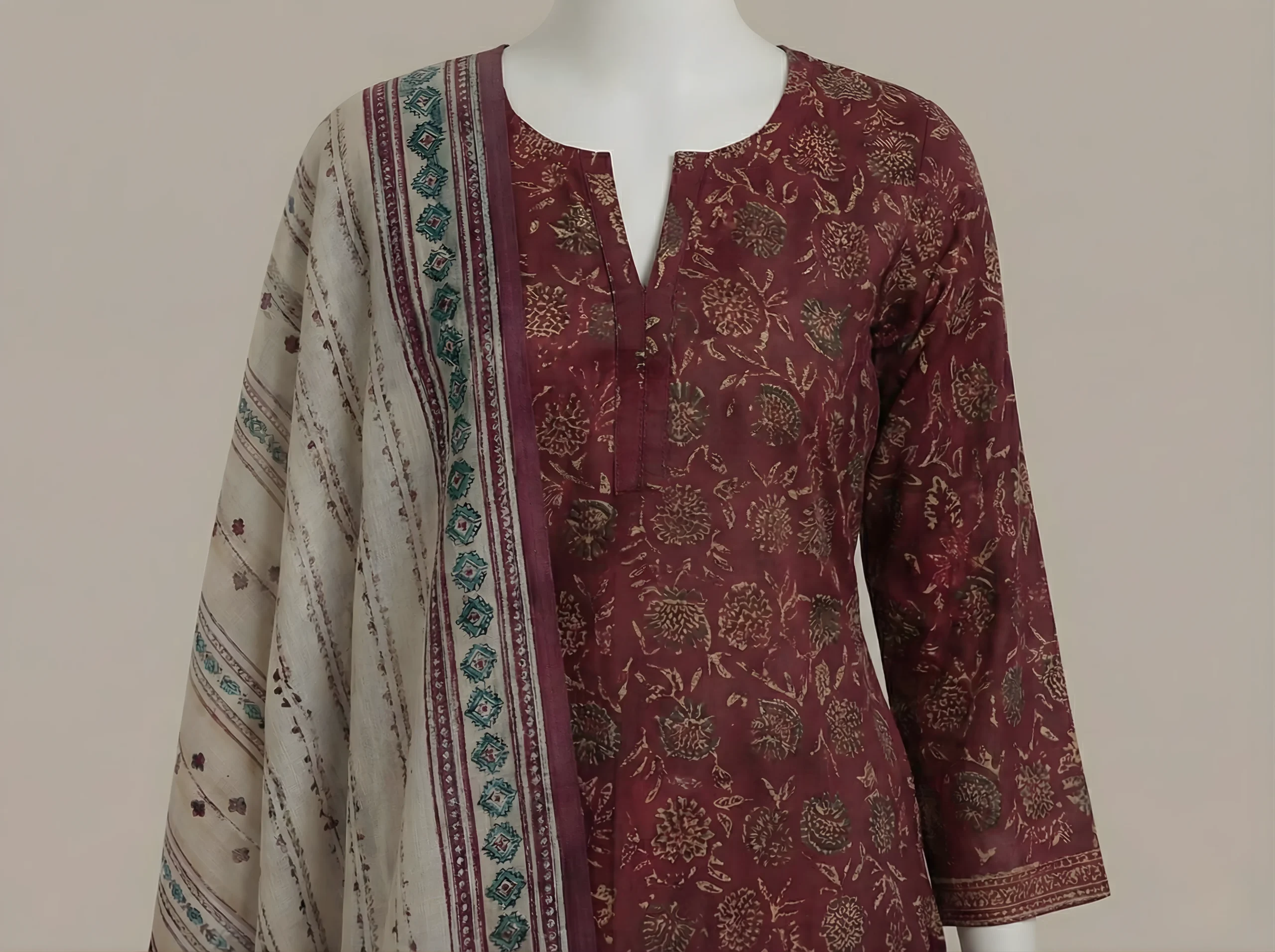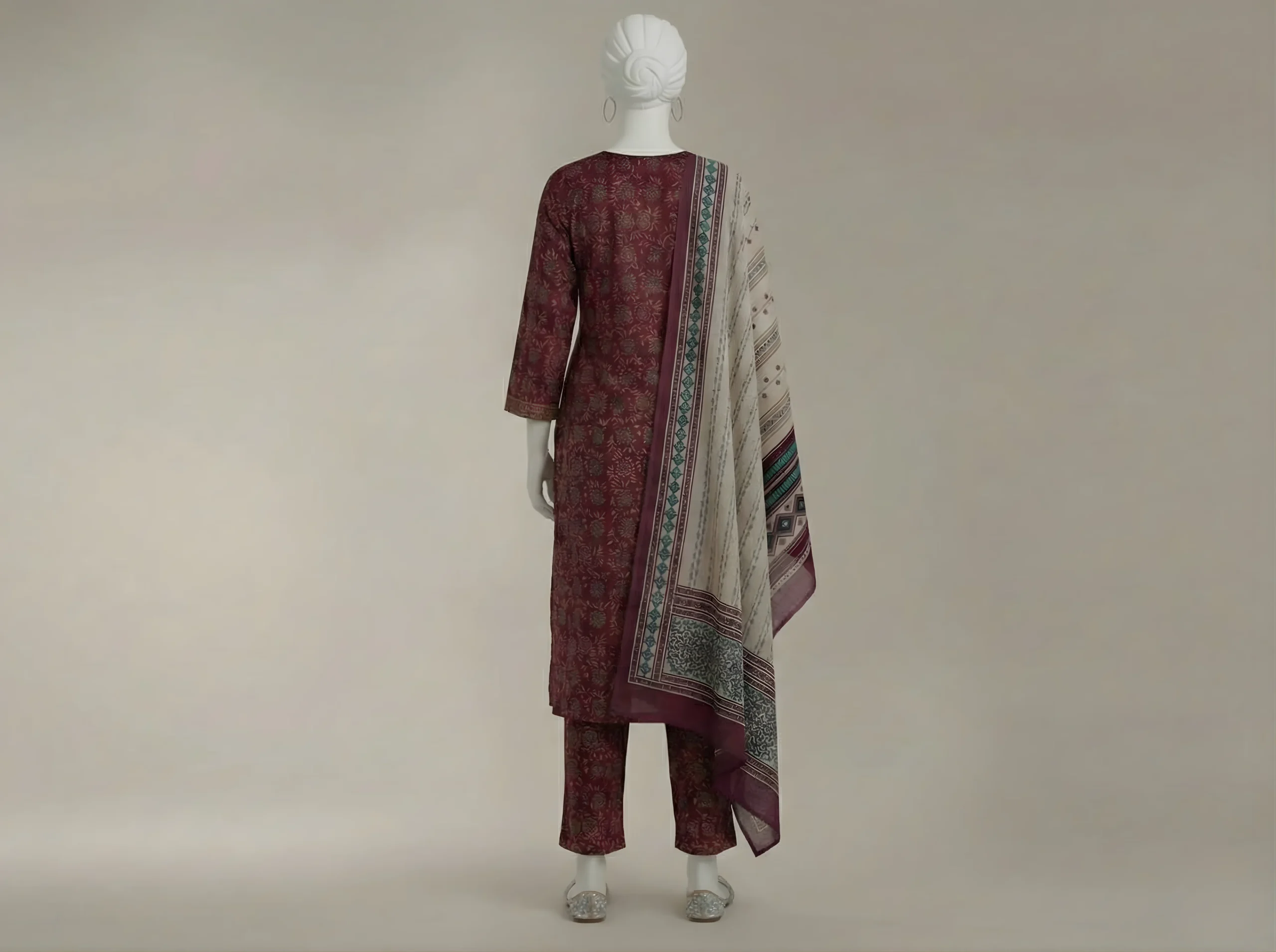 Our three-piece deep maroon Khaddar suit includes a printed shirt and matching printed trouser. It is paired with a printed Khaddar dupatta for a graceful, coordinated look.
