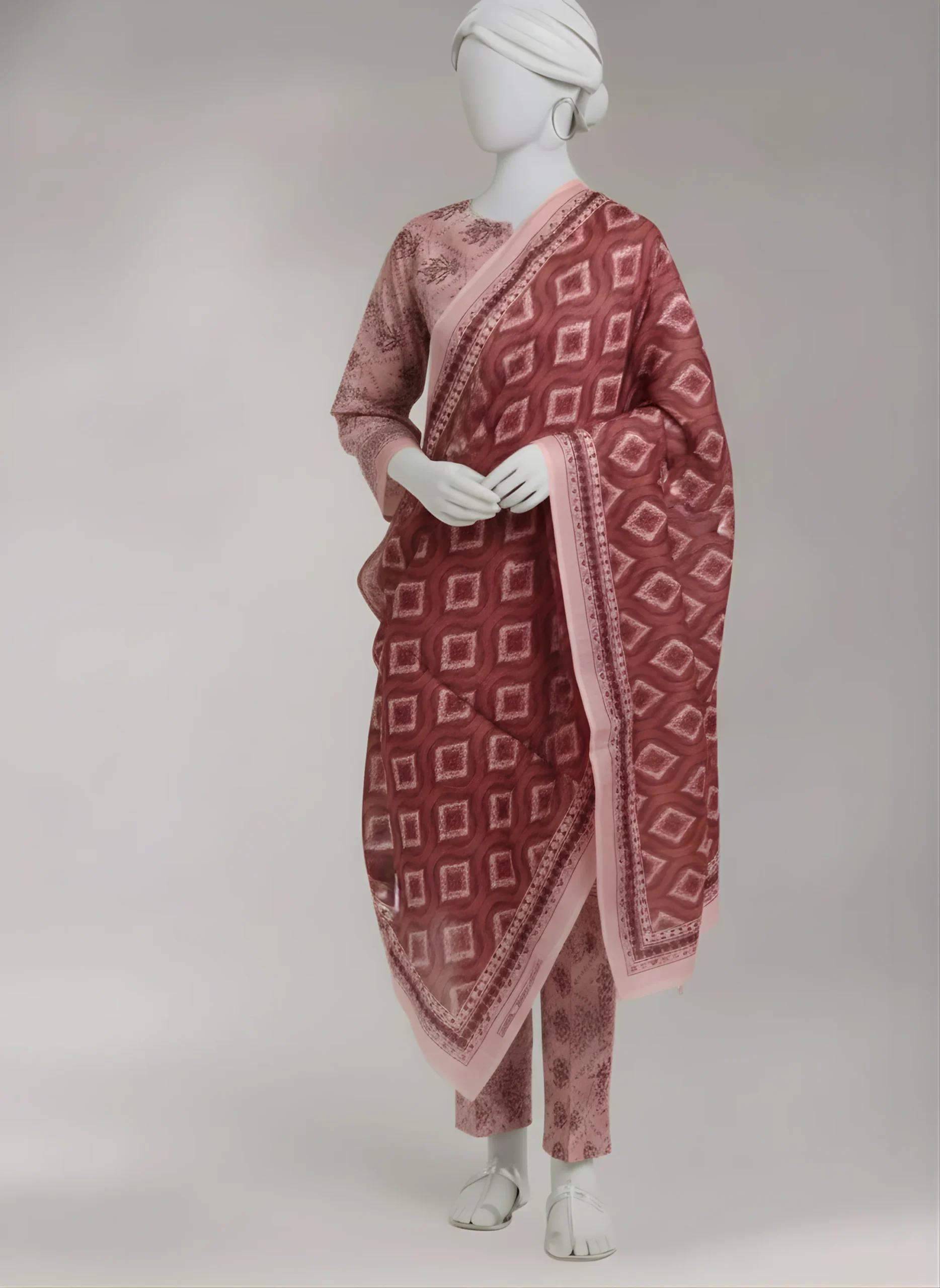 Our three-piece pink Khaddar suit includes a printed shirt and matching printed trouser. It is paired with a printed Khaddar dupatta for a graceful, coordinated look.