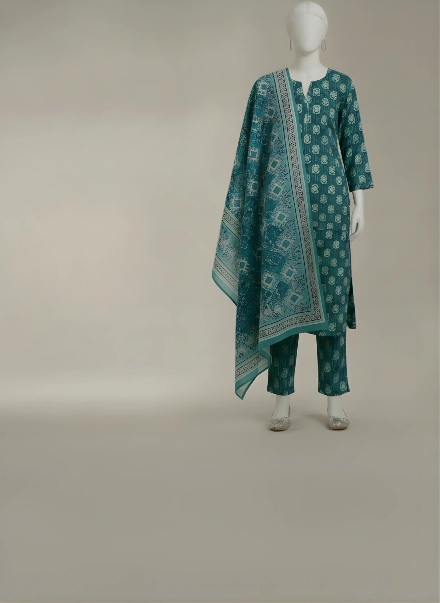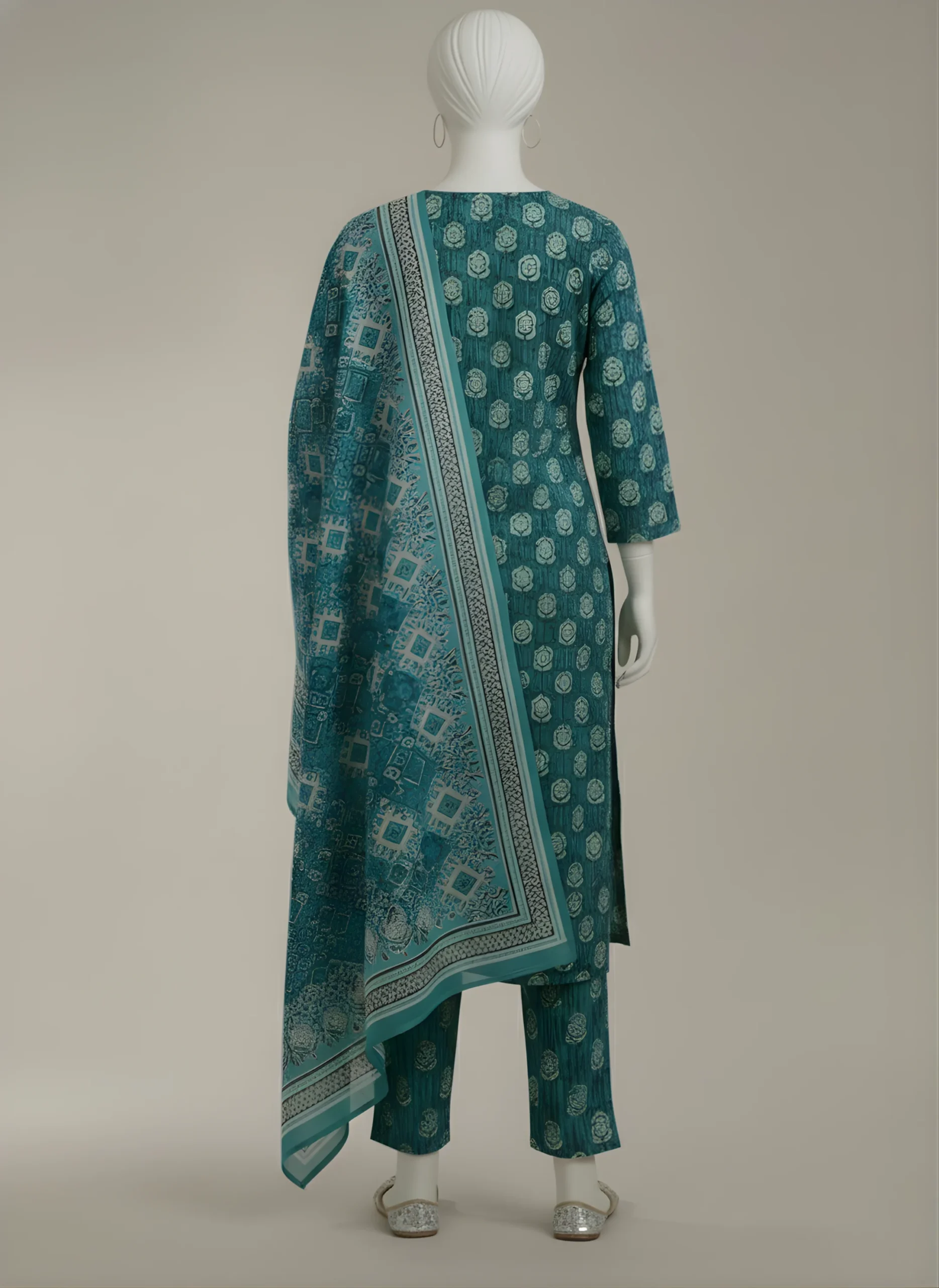 Our three-piece sea green Khaddar suit includes a printed shirt and matching printed trouser. It is paired with a printed Khaddar dupatta for a graceful, coordinated look.