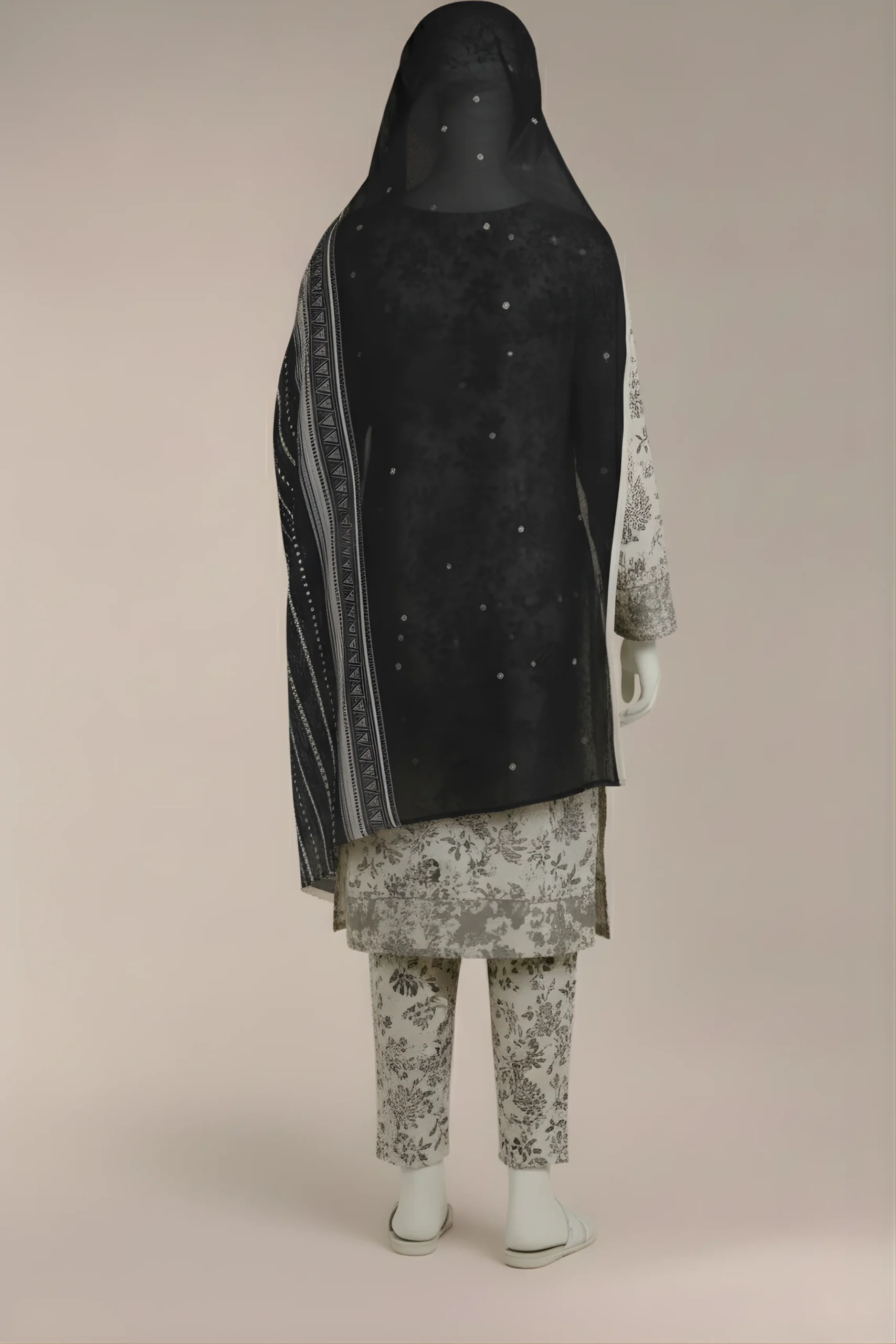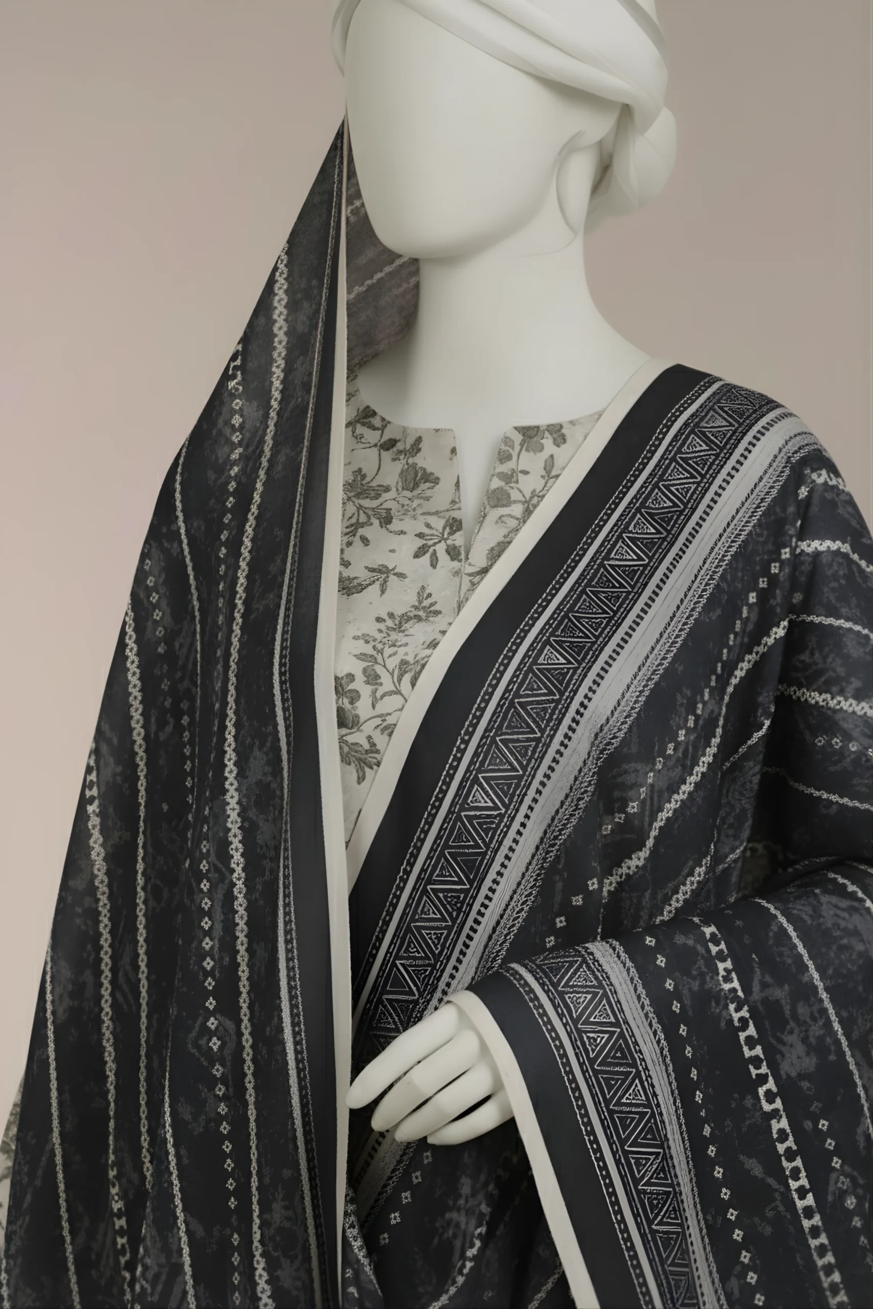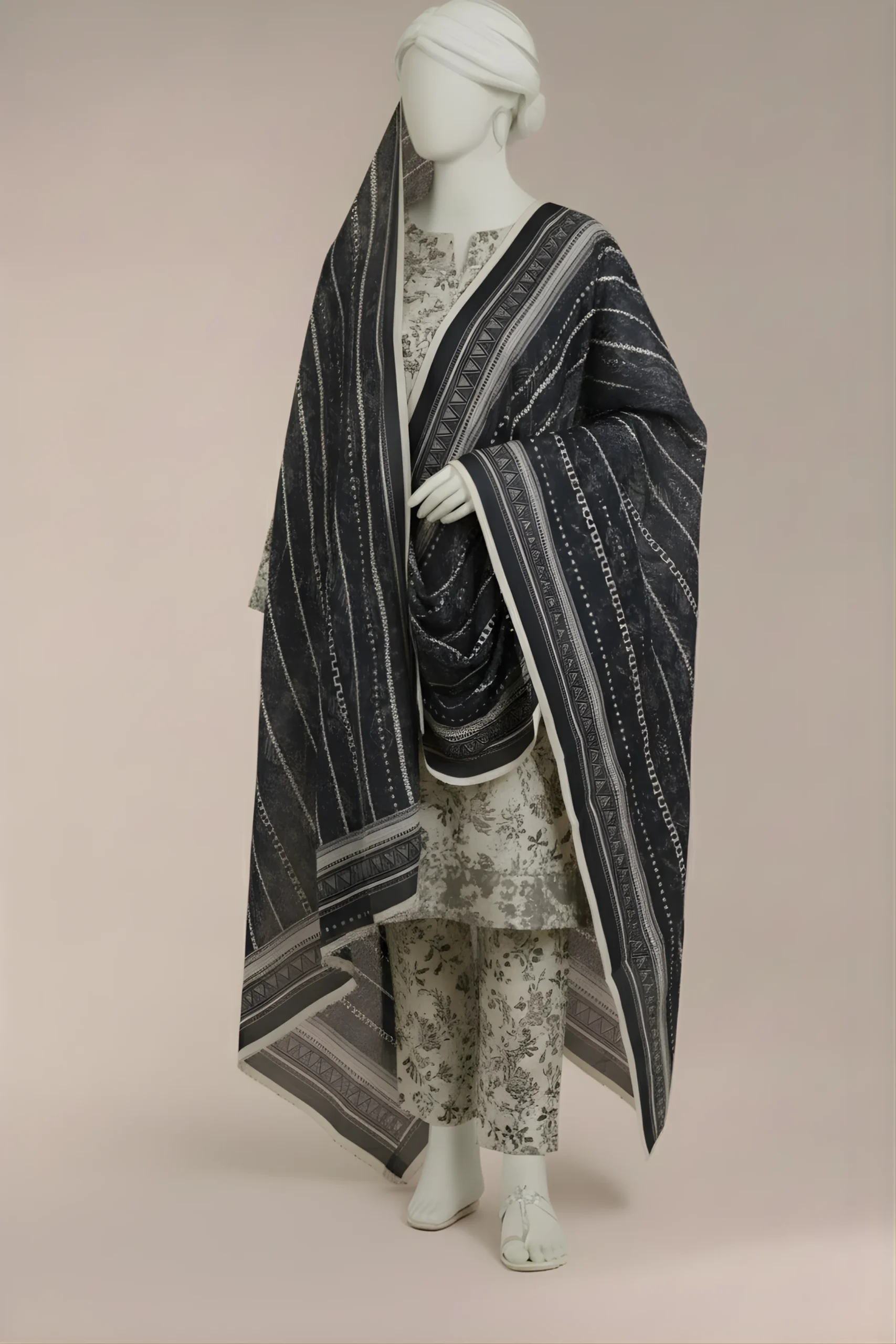 Our three-piece off white Khaddar suit includes a printed shirt and matching printed trouser. It is paired with a printed Khaddar dupatta for a graceful, coordinated look.