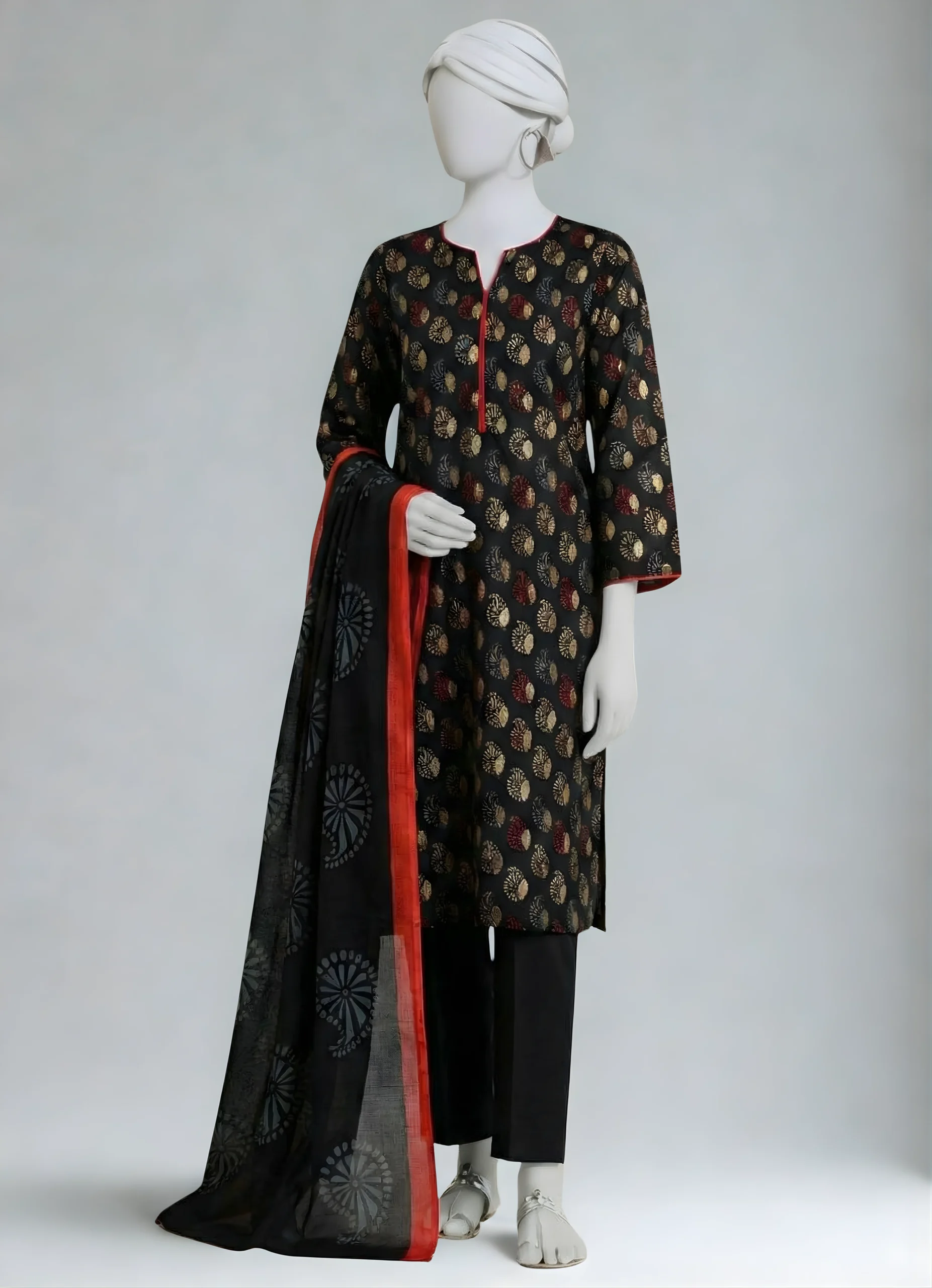 Introducing our three-piece black Marina suit, featuring a printed Marina shirt paired with a plain Marina trouser. The look is completed with a ready-to-wear printed Marina shawl for a soft, elegant finish.