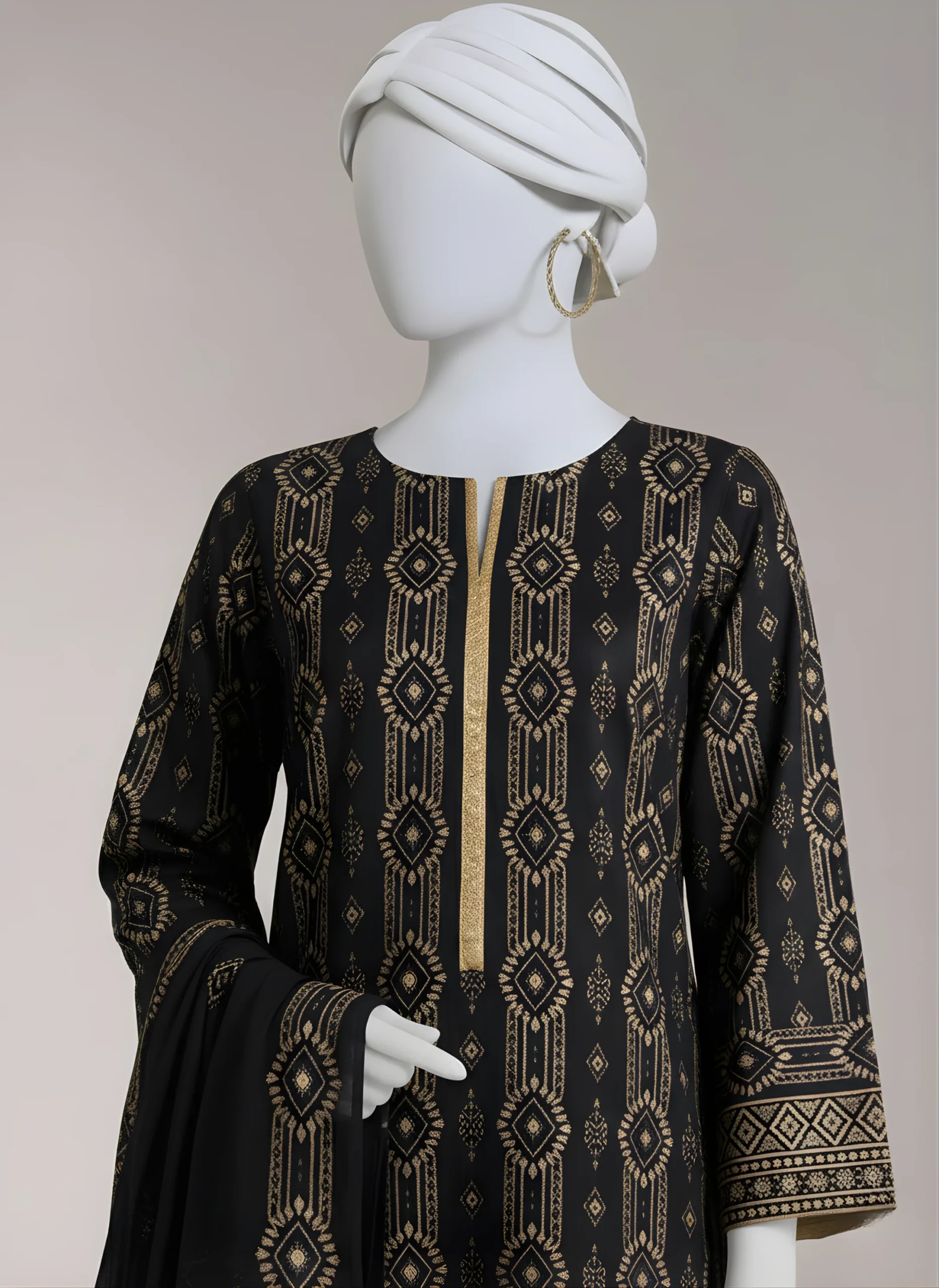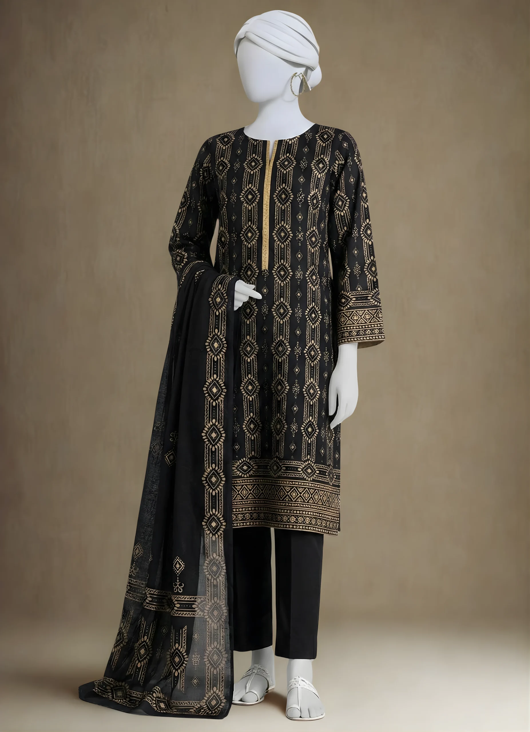 Introducing our three-piece black Marina suit, featuring a printed Marina shirt paired with a plain Marina trouser. The look is completed with a ready-to-wear printed Marina shawl for a soft, elegant finish.