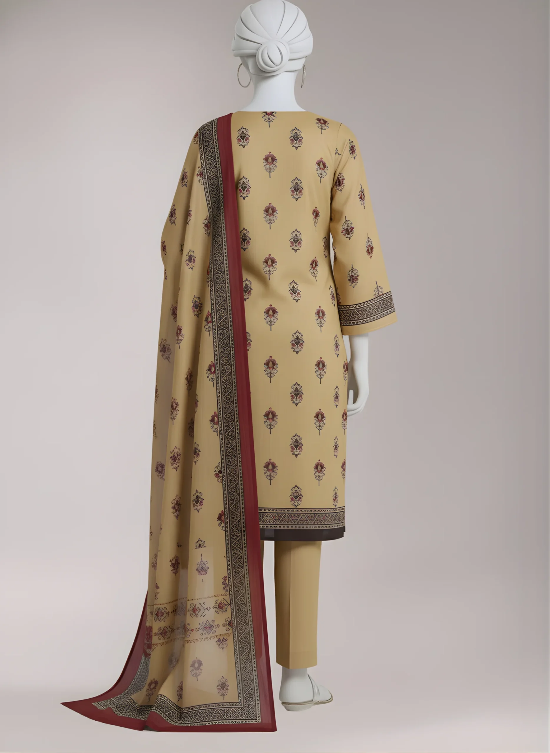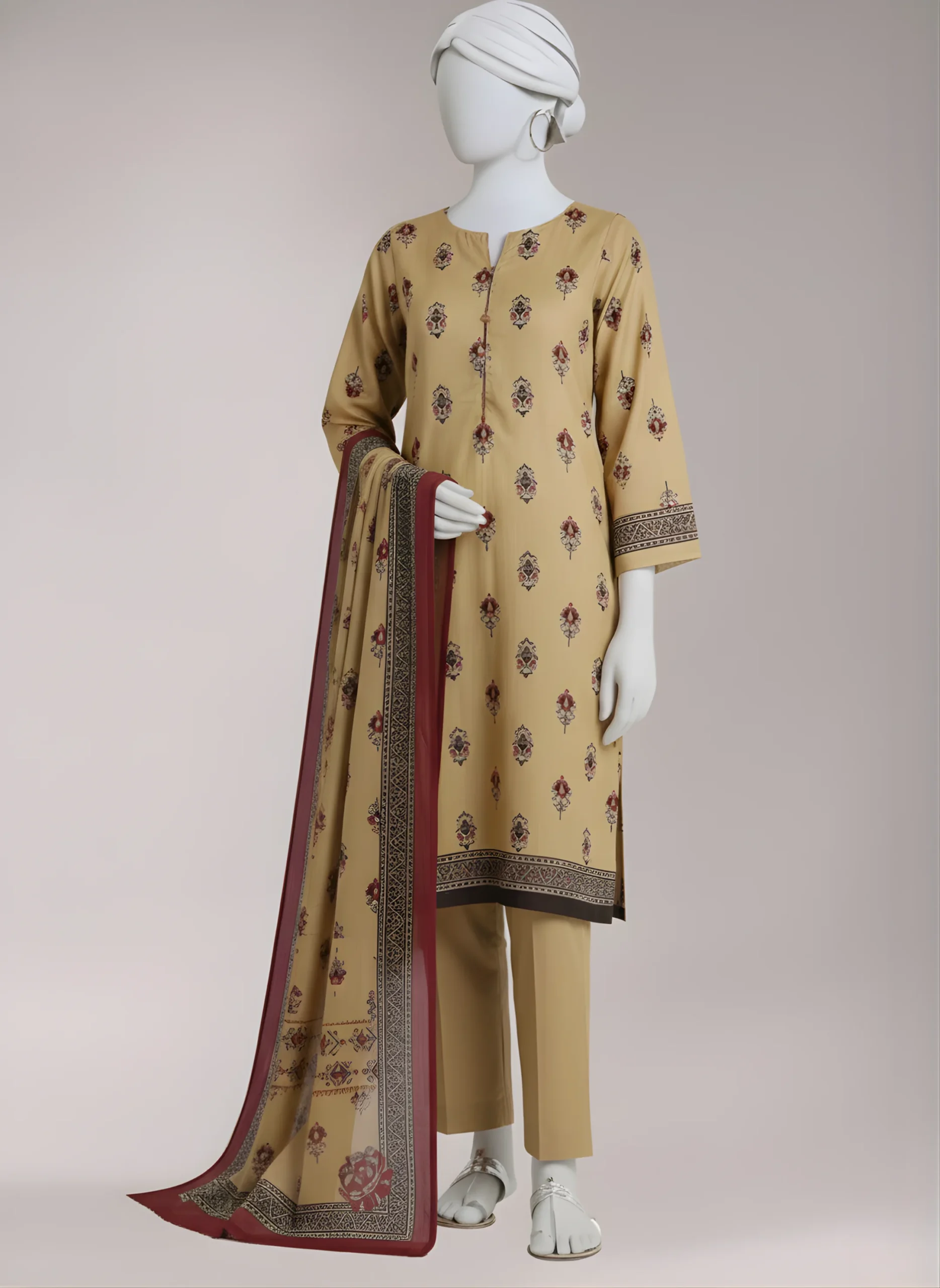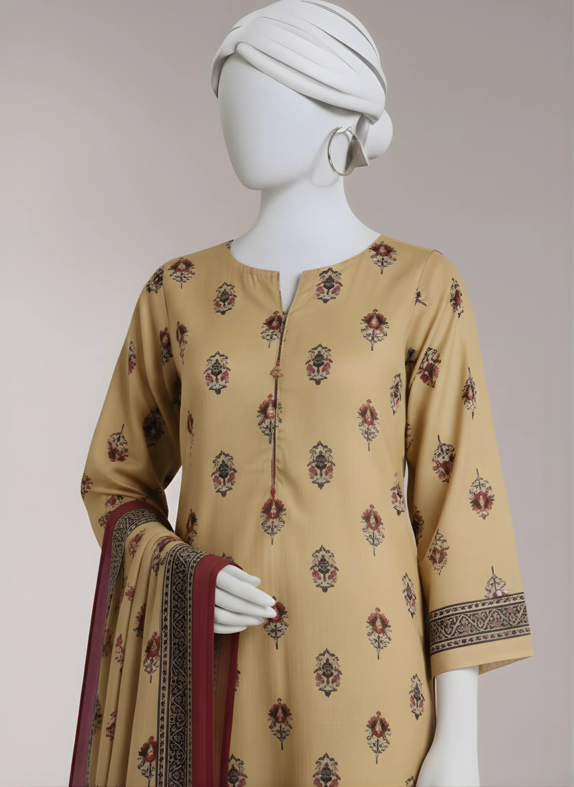 Introducing our three-piece golden beige Marina suit, featuring a printed Marina shirt paired with a plain Marina trouser. The look is completed with a ready-to-wear printed Marina shawl for a soft, elegant finish.